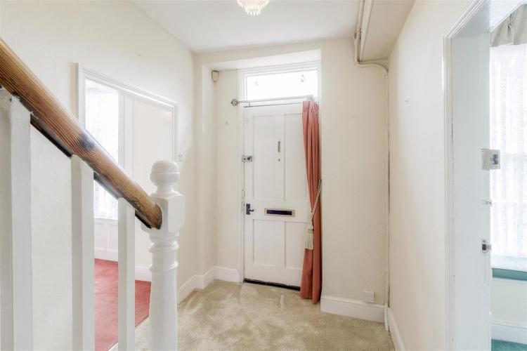 Panelled front door, radiator, staircase rising to 1st floor landing and panelled doors off to dining room, living room and lobby.