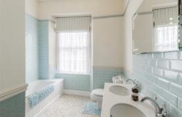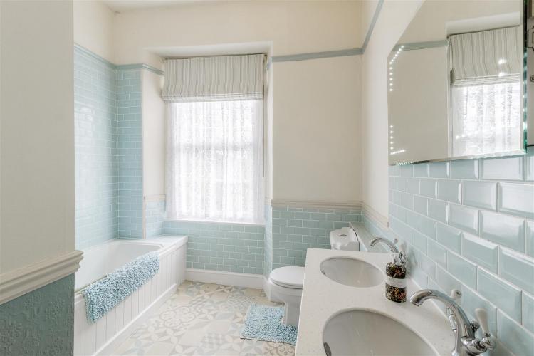 Refitted with a white suite comprising twin basin vanity unit, WC and bath with shower mixer tap. Column radiator/towel airer, picture rail and window to front.