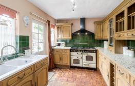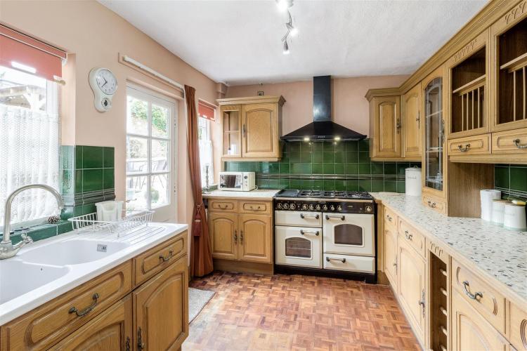 Twin bowl sink, base cupboards, wall cupboards and work-surface areas. Rangemaster cooker. Concealed space for washing machine. Windows to side. Door to garden.