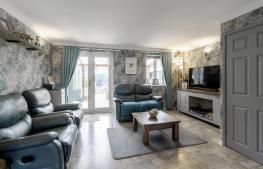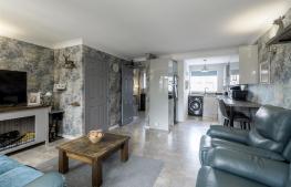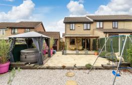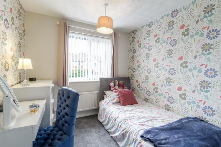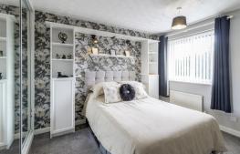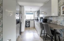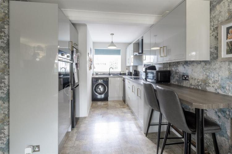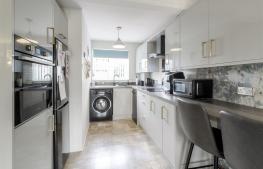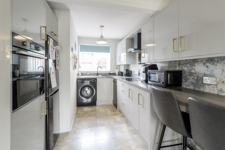 A spacious open plan room. Lounge/diner area with under-stairs cupboard, coving, radiator, UPVC double-glazed window to the rear and UPVC double-glazed French doors that open to the rear covered patio. Kitchen area with a range of grey high gloss units to include single drainer sink, base pan drawers, base storage cupboards, wall cupboards, work-surface areas and breakfast bar. Ceramic hob, filter hood and electric oven. Space and plumbing for washing machine. Space and plumbing for slimline dishwasher. Gas central heating boiler. UPVC double-glazed window to the front.