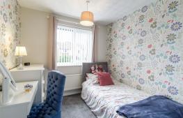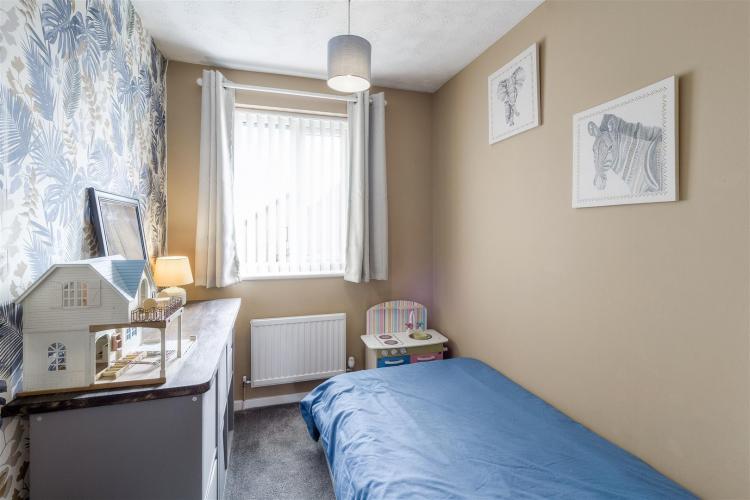 Wardrobe/storage recess with curtain front. Radiator and UPVC double-glazed window to the front.