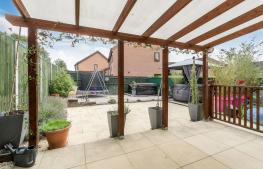 Easily maintained rear garden with covered patio, further patio, deck and crushed stone surfacing.
