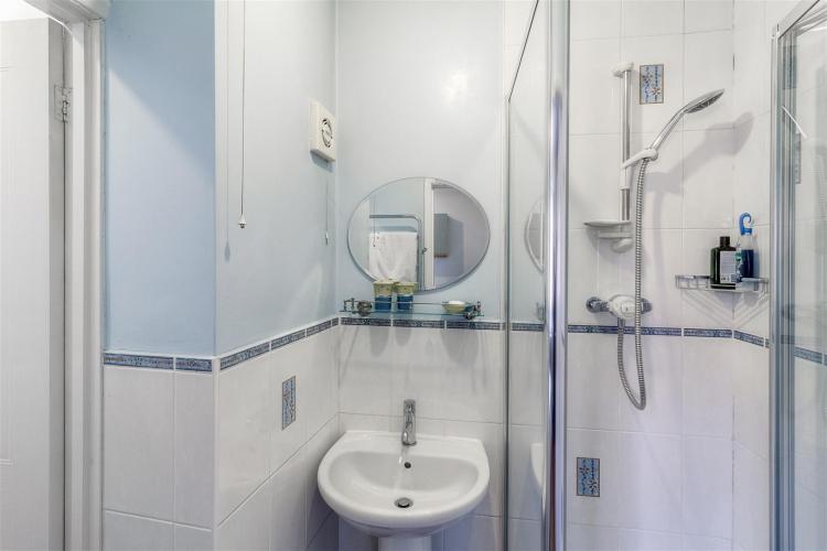 Shower enclosure and washbasin. Part tiled walls, extractor fan, electric towel radiator and door to WC.