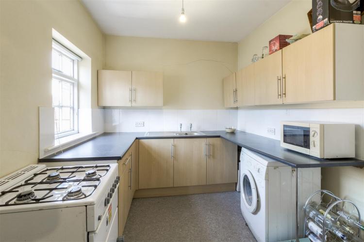 Single drainer sink, base cupboards, base drawers, wall cupboards and worksurface areas. Plumbing for washing machine, gas cooker, Heatrae Sadia electric domestic water heater, gas convector heater, window to the front and door to shower room.