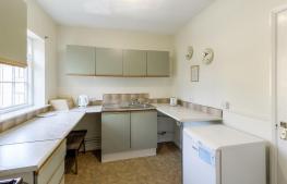 Single drainer stainless steel sink, base cupboards, wall cupboards and worksurface areas. Plumbing for washing machine, night storage heater, Main Medway gas domestic water heater, window to the front and door to shower room.