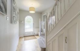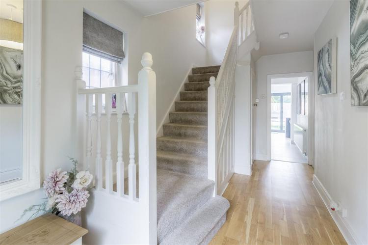 Double glazed door opening into a spacious 'through' hallway that has laminate flooring, window to the side, period staircase rising to the first floor, understairs storage cupboard and doors to all ground floor rooms.