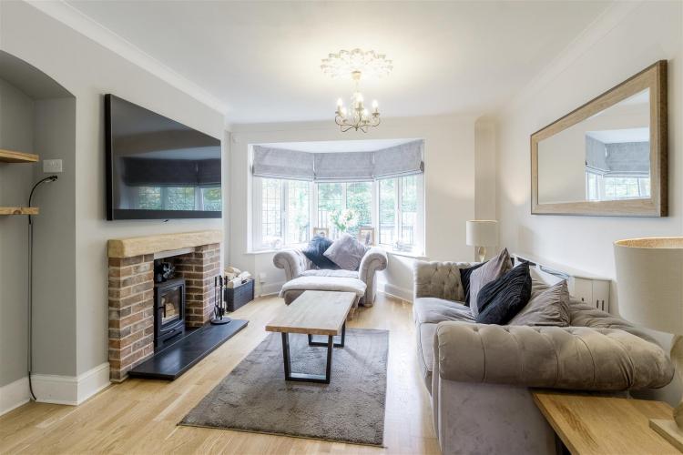 Bay fronted main reception room that features double glazed window, wood laminate flooring, brick fire place with wood burning stove, and radiator. Opening to the dining room.