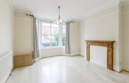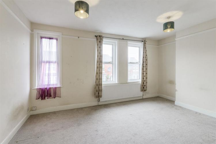 Mock fireplace, double radiator, period ceiling coving, picture rail, electricity meter/consumer unit cupboard and UPVC double-glazed bay window to the front.