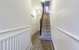 Decorative tiled floor, dado rail, picture rail, period ceiling coving, double radiator, staircase rising to first floor landing, under-stairs cupboard and original stripped pine doors off to living room and kitchen.