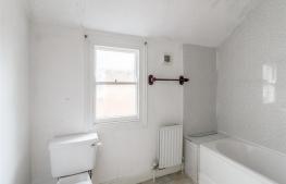 White suite comprising close coupled WC, pedestal washbasin and bath with Triton Enrich electric shower over. Double radiator, extractor fan and sash window to the side.