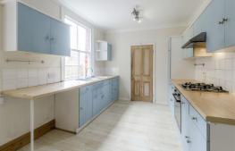 1.5 bowl stainless steel sink, base cupboards, base drawers, wall cupboards, tall larder style cupboard and work-surface areas. Gas hob, filter hood and electric oven. Ceiling coving, double radiator, two sash windows to the side and pine door leading to the utility room.