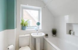 White suite comprising close coupled WC, pedestal washbasin and shower bath. Part tiled walls, chrome towel radiator and UPVC double glazed window to the side.