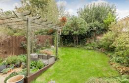 South easterly aspect rear garden with lawn and established shrubs. Pergola.