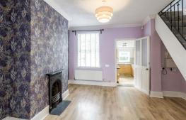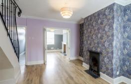 Feature cast iron decorative fireplace, double radiator, ceiling coving, staircase rising to 1st floor, UPVC double-glazed window to the rear, part glazed panel door to kitchen and folding doors leading through to the living room.