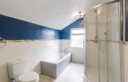 With white suite comprising close-coupled WC, pedestal washbasin, panelled bath and separate shower enclosure. Radiator/towel airer, extractor fan, storage cupboard (housing the gas fired Worcester central heating boiler which was replaced in March 2025) and UPVC double-glazed windows to the rear..
