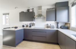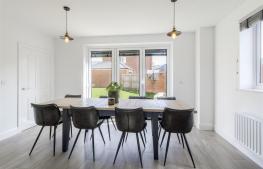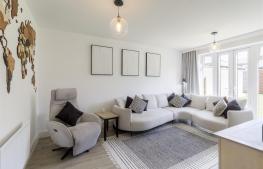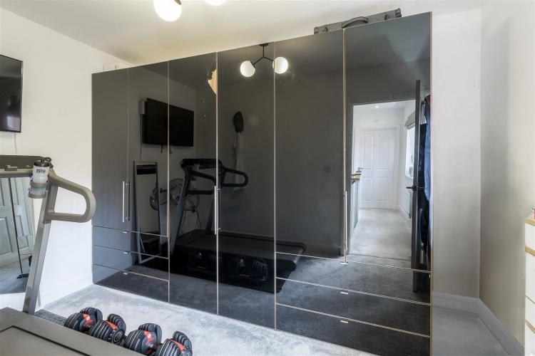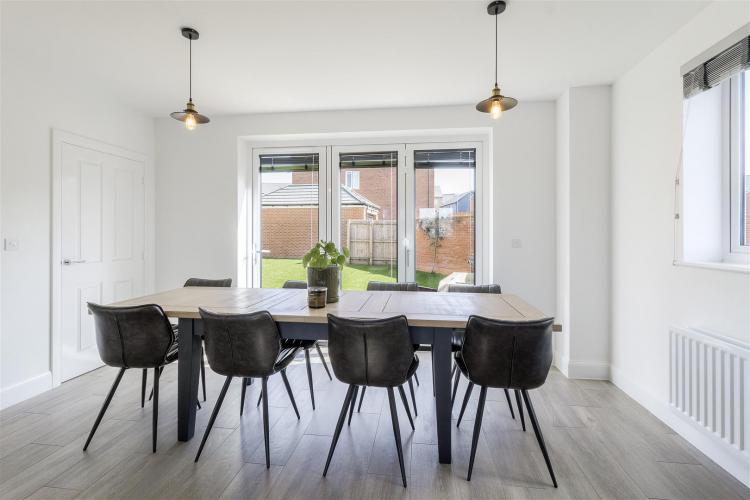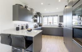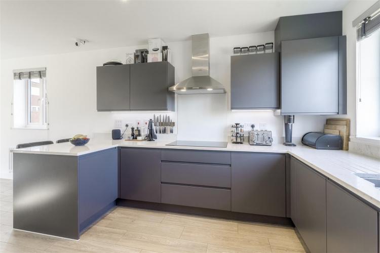 Comprehensively fitted with anthracite coloured units comprising 1.5 bowl built-under sink with mixer tap, manufactured quartz worktops, base cupboards, base drawers and wall mounted cupboards. Range of Bosch appliances including 5 ring induction hob, stainless steel extractor hood, integrated dishwasher, integrated fridge/freezer. fitted microwave and electric oven. Under cabinet LED lighting, inset ceiling lighting, two radiators, UPVC double-glazed window to the front with views over parkland, UPVC double-glazed window to the side and wide bifold double-glazed door to the rear garden. Under stairs utility cupboard with plumbing for automatic washing machine. .