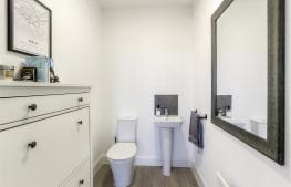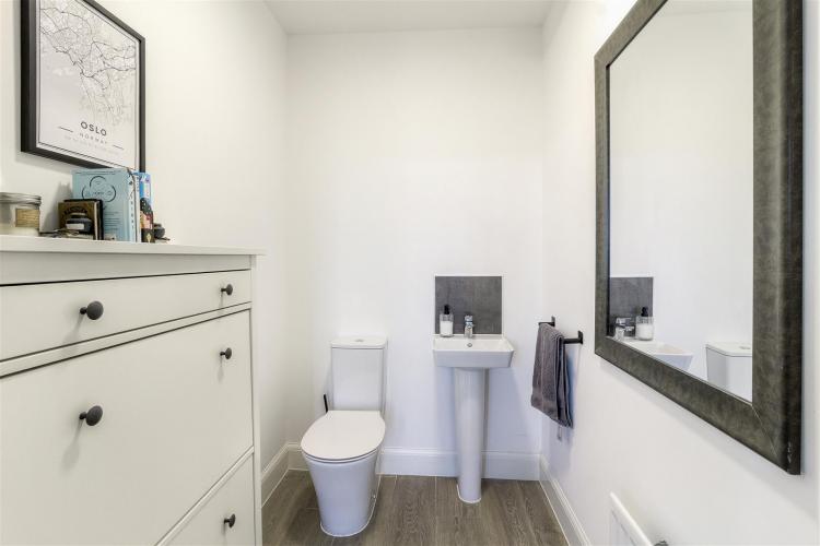 A good sized cloakroom with white suite comprising close-coupled WC and pedestal wash basin. Radiator & extractor fan.