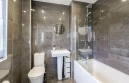 With white suite comprising close-coupled WC, pedestal washbasin and panelled bath with shower over bath and glazed shower screen. Chrome towel radiator, tiled walls, tiled floor, inset ceiling lighting and UPVC double-glazed window to the rear.