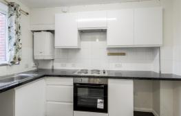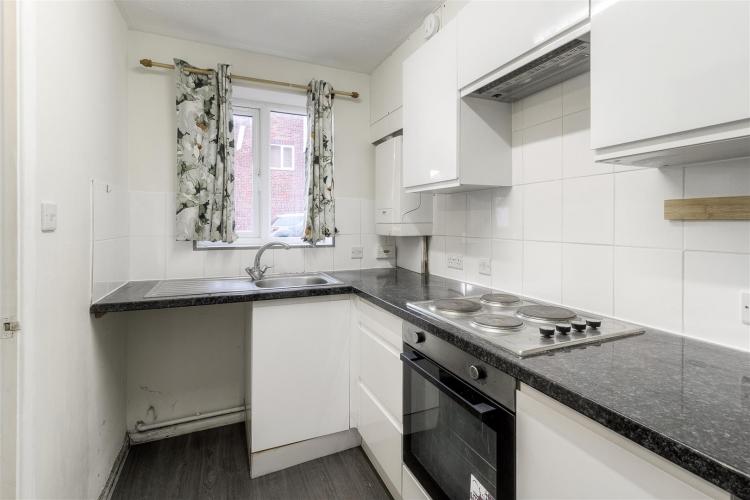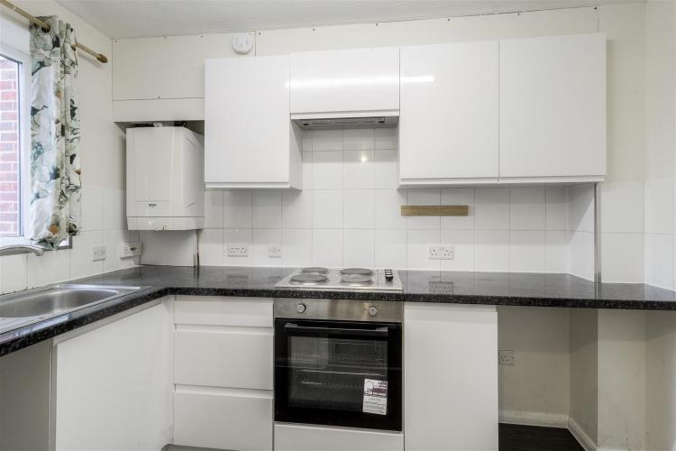 Single drainer stainless steel sink, base cupboards, base drawers, wall cupboards and work-surfaces. Electric oven, electric hob and filter hood. Radiator, plumbing for washing machine, Baxi 400 gas central heating boiler and UPVC double-glazed window to the front.
