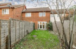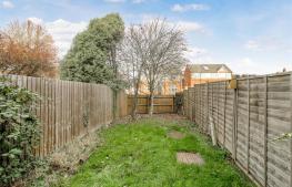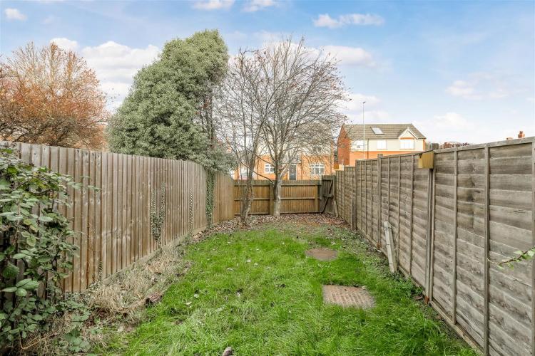 Paved patio, two ornamental trees and lawn. Rear pedestrian access gate.