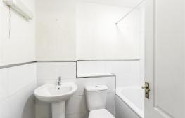Modern white suite comprising WC, pedestal wash basin and bath with Triton Enrich shower over. Shaver light and part tiled walls.
