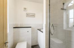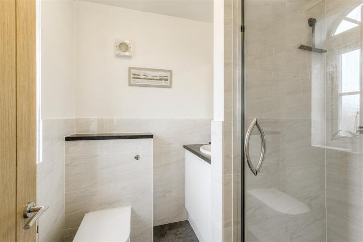 Stylish refitted suite that features WC, shower cubicle, wash hand basin with vanity unit under, UPVC double glazed window to the front, extractor fan, splash backs.