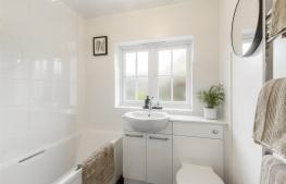 Modern refitted suite with bath and shower over, WC with vanity unit, ceramic sink, UPVC double glazed window to the rear, towel rail, splash backs.