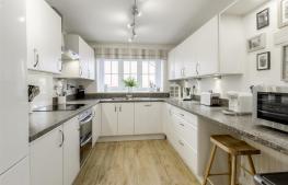 Modern, refitted kitchen that features wall mounted and base level cupboards, soft close pull out drawers, works tops, steel sink and drainer, splash backs, integrated induction hob, oven with chimney style cooker hood over, breakfast bar with radiator under, kardene flooring, plumbing for a washing machine, UPVC double glazed window to the front, UPVC double door to the side.