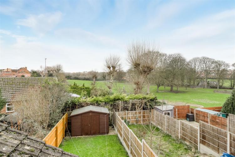The enclosed rear garden, which features a lovely patio area alongside a grassed area. Additionally, a shed offers convenient storage for outdoor equipment.