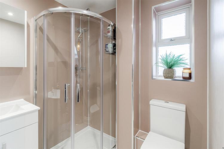 Smartly refitted suite with corner shower cubicle, wash hand basin, Perspex splash backs and WC.