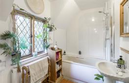 Bath with shower over, tile splash backs, WC, wash hand basin, radiator.