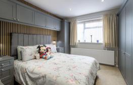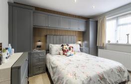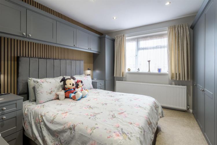 With a range of newly fitted bedroom furniture to include wardrobes, storage drawers, bedside lockers and over-bed storage lockers. Radiator, inset ceiling lighting and UPVC double-glazed window to the front.