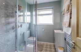 Refitted in 2023 and now comprising spacious shower enclosure, vanity washbasin and close-coupled toilet. Chrome towel radiator, extractor fan, inset ceiling lighting and UPVC double-glazed window to the rear.